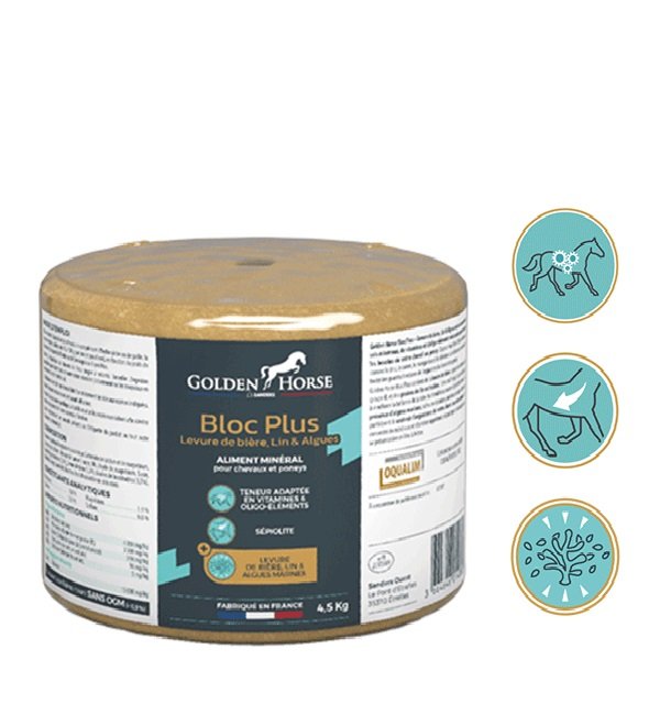 Golden Horse Bloc Plus  – Levadura de Cerveza, Lino y Algas Marinas es un concentrado de sales minerales y oligoelementos en forma quelada e hidroxilada, necesarios para cubrir las necesidades de su caballo o poni.