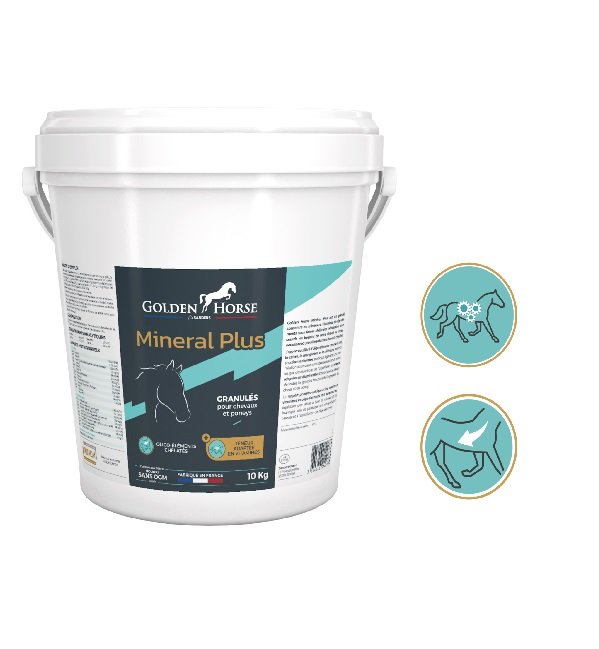 Golden Horse Mineral Plus es un pienso concentrado en forma de gránulos que contiene minerales, vitaminas y oligoelementos quelados, necesarios para cubrir las necesidades de su caballo o poni alimentado con una dieta a base de cereales . Los niveles adecuados de  vitaminas E y C  contribuyen al correcto funcionamiento de las principales funciones corporales de caballos y ponis.