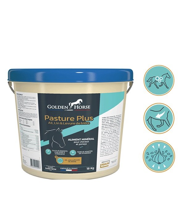 Golden Horse Pasture Plus – Ajo, Linaza y Levadura de Cerveza es un alimento mineral especialmente formulado para proporcionar a su caballo o poni la energía, las proteínas, los minerales, las vitaminas y los oligoelementos en forma quelada e hidroxilada necesarios para satisfacer sus necesidades nutricionales básicas.